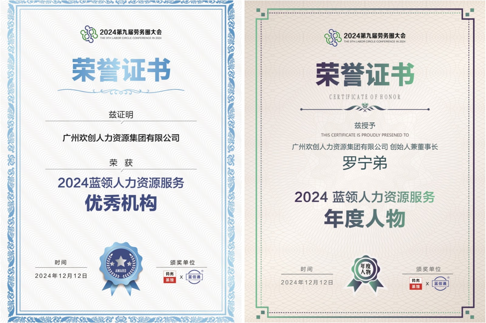 欢创集团荣获“2024第九届劳务圈大会”两项大奖,总裁陈文舒与行业大咖共话“增长有道”